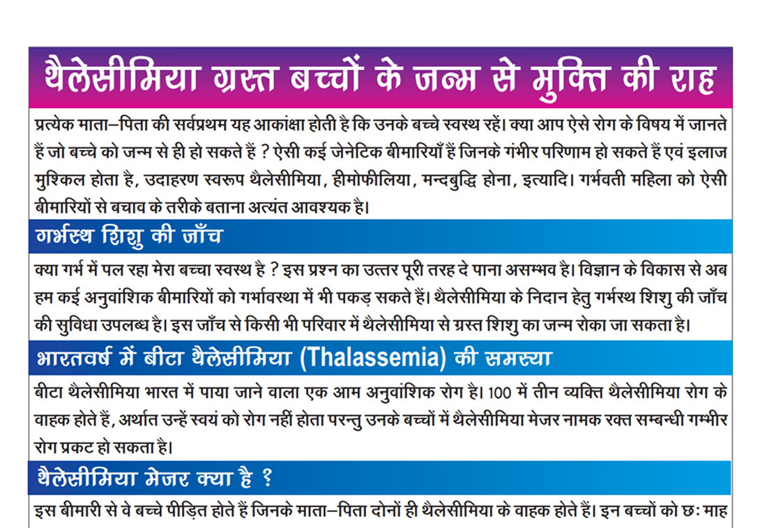 Hindi awareness guide on thalassemia prevention, screening and family care.